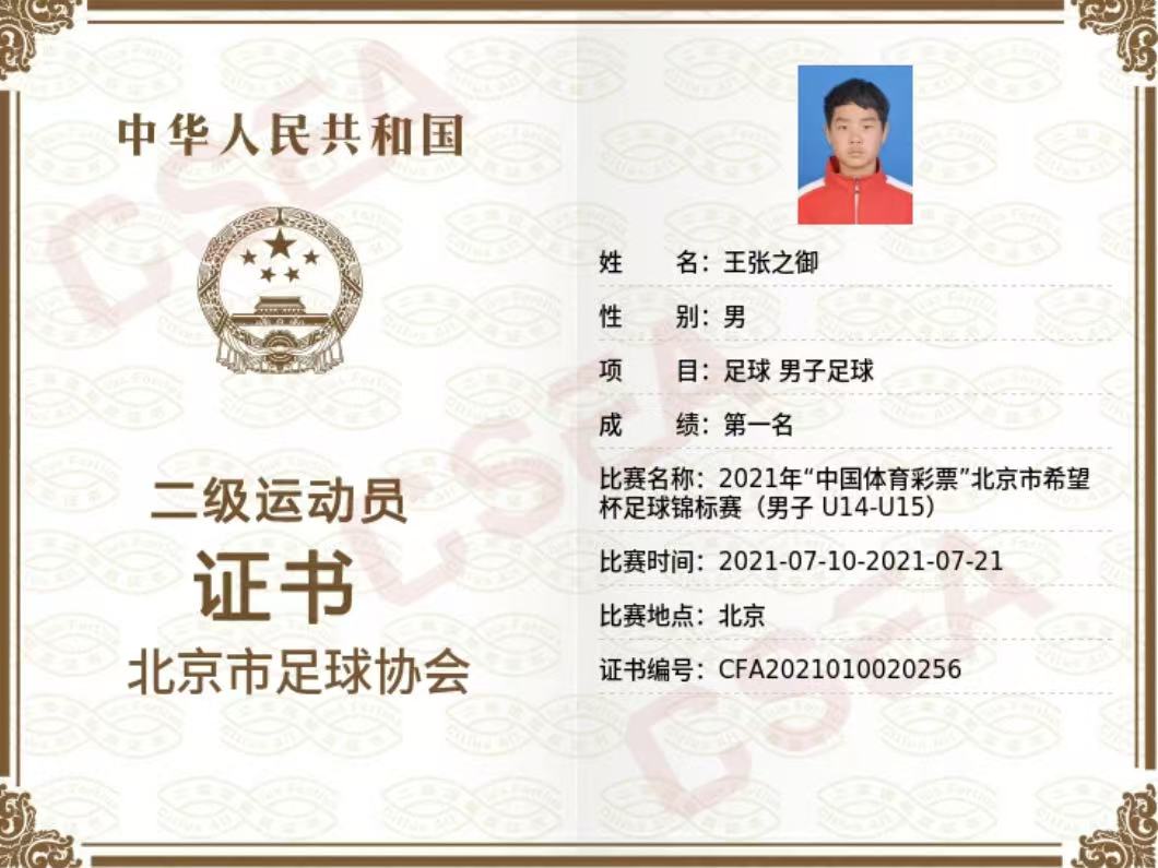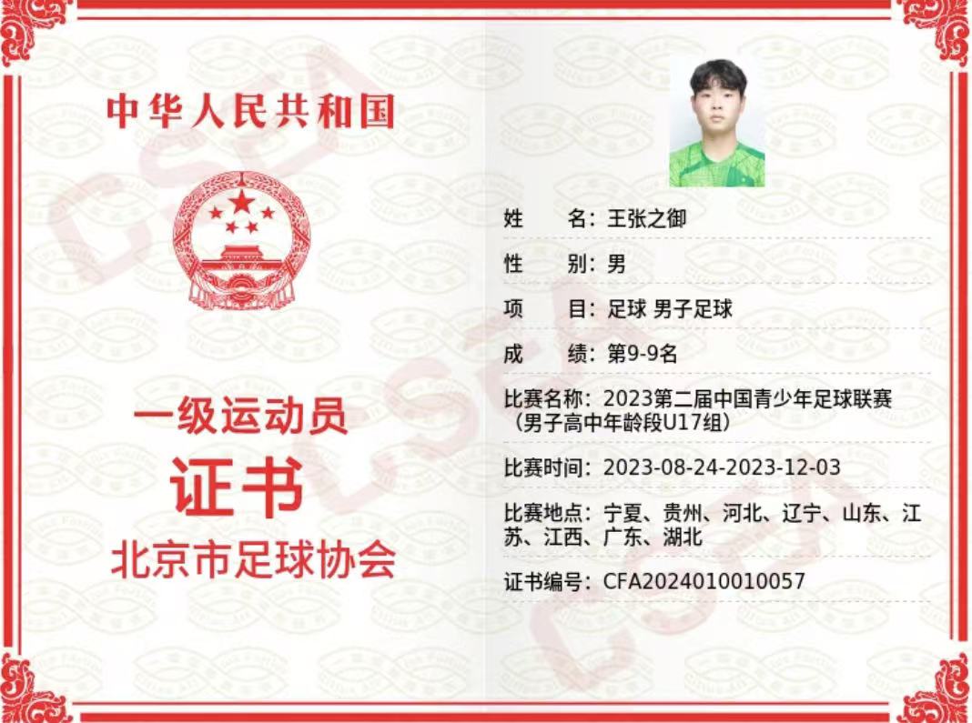 在与足球相伴的日日夜夜中,他随队参加了各种比赛,曾获2021年北京希望杯乙组冠军、2021年中国青超U15联赛全国16强、2022年中国U17青超联赛全国十六强、2023年中国青超U17联赛第九名以及2023年中国U17职业梯队联赛第八名等荣誉,自身也成为了国家级一级足球运动员。