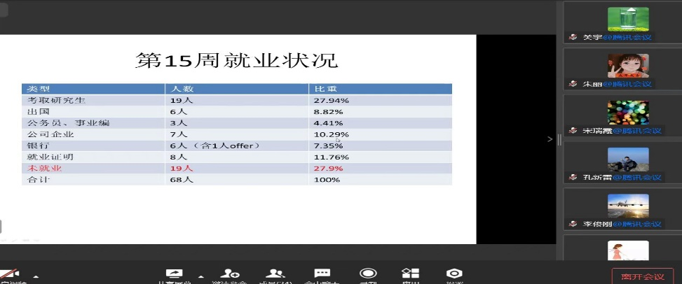 数学系副主任郑权、责任教授宋瑞霞和统计系主任助理陈云、责任教授徐礼文等老师分别汇报了本周每名本科生和研究生的就业进展,并与上周的就业数据情况进行了对比和帮扶进展经验总结,针对本系就业困难群体如何进行精准帮扶,提出了具体措施。
