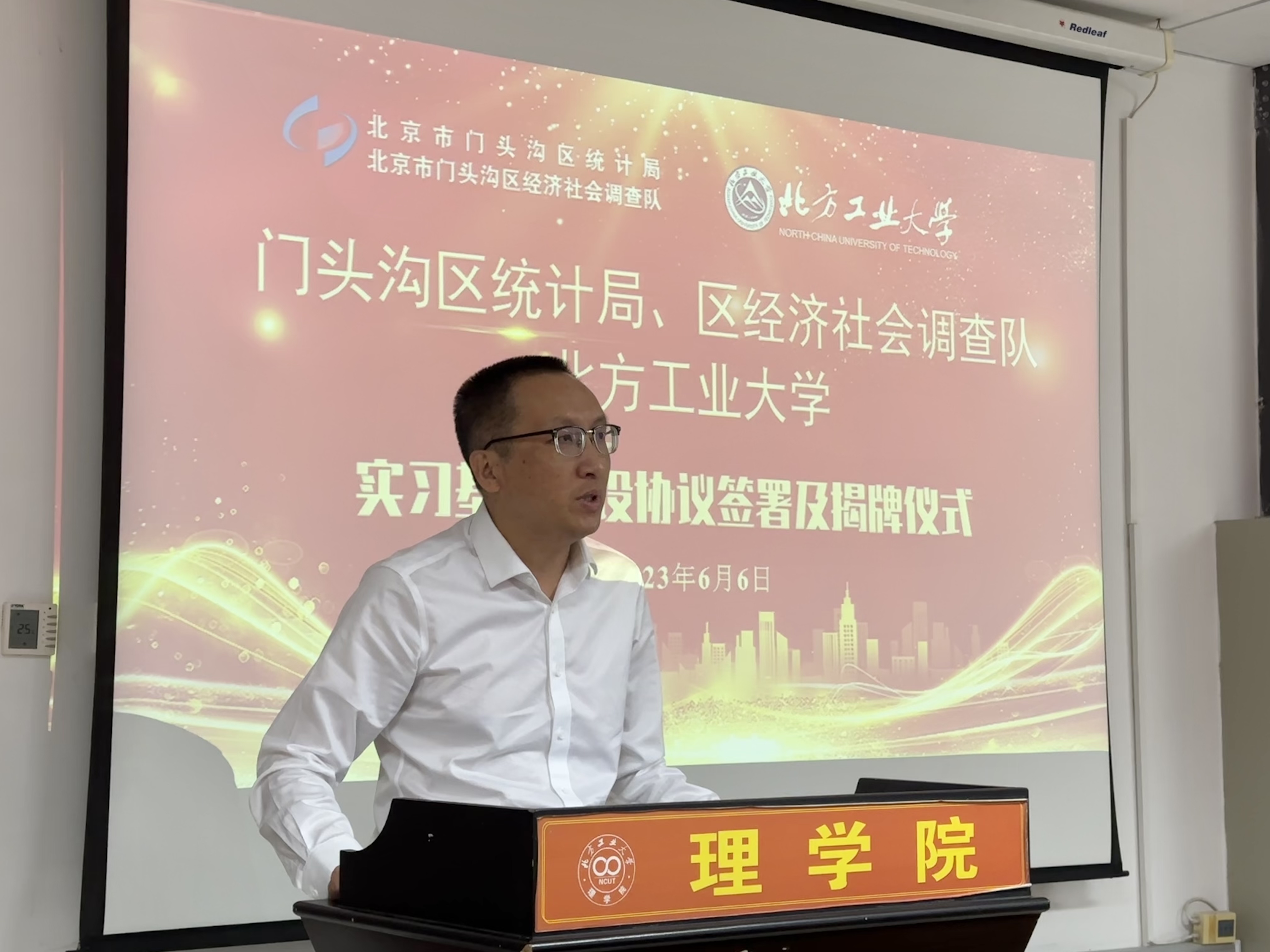 6月6日下午,北京市门头沟区统计局党组书记、局长谢晓东,北京市门头沟区统计局党组副书记、调查队队长宋长江、北京市门头沟区统计局党组成员、三级调研员王荣敏等一行15人莅临十大信誉官网,与十大信誉官网共商区校合作,携手发展事宜,双方共同签署了校外实习基地建设协议,并举行了实习基地揭牌仪式。澳门十大信誉好的网站党委常委、副校长栗苹,澳门十大信誉好的网站班子成员、统计学系全体教师参加了仪式。仪式由澳门十大信誉好的网站党委副书记、院长李冱岸主持。