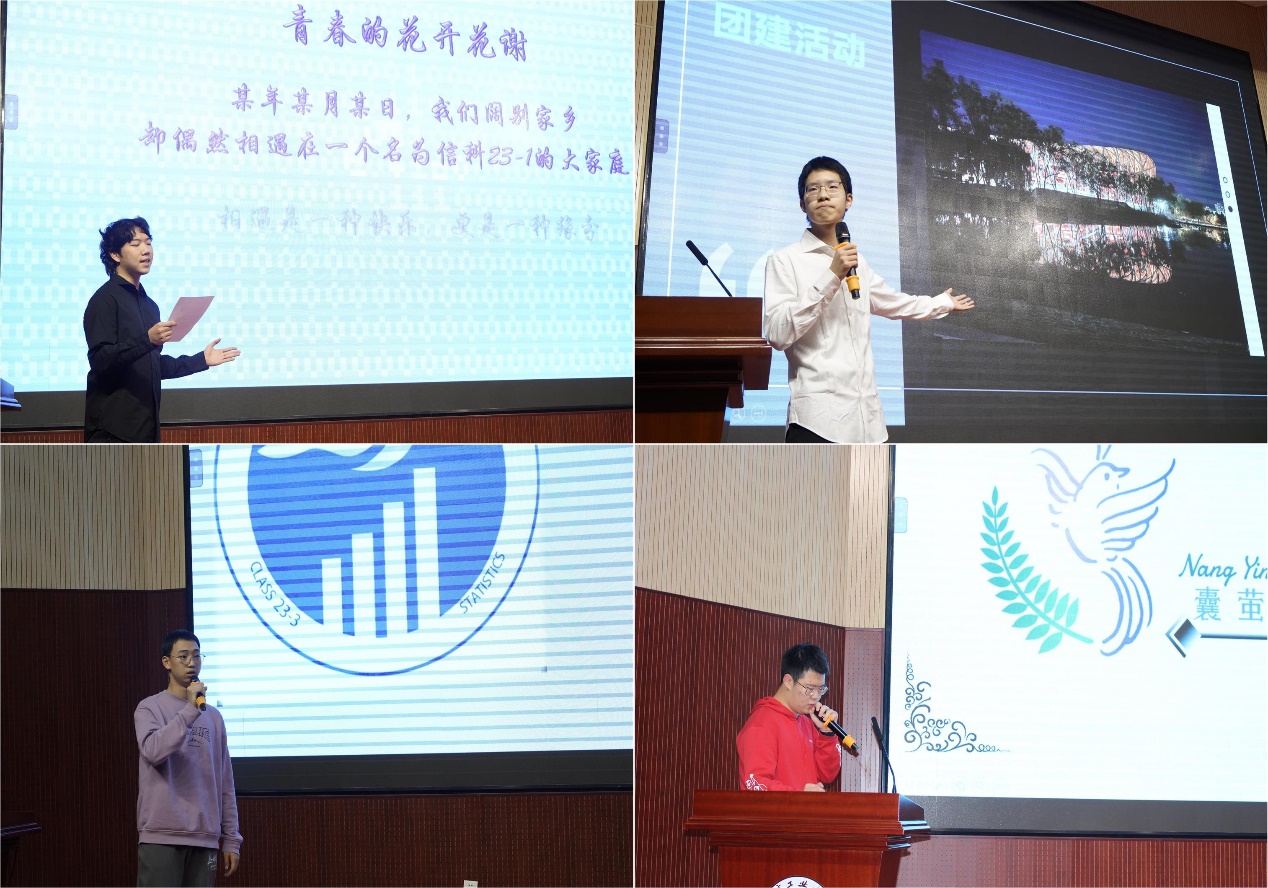 信23-1班班徽以欧拉公式为原型,将数学符号变形,传递出无涯学海中一缕灵动与光彩;统22-2班班训为“囊萤之光,汇汇如炬”,表明班级刻苦学习,积极向上的优良学风,硕果累累的奖状便是最好的证明,同时“囊萤之光”寓意班级中每一位同学都如繁星一点,熠熠生辉;信23-3班班徽中“3”形的波浪象征信科3班,帆船溯流而上,寓意信科3班同学能够乘风破浪,勇攀高峰,拥有战胜一切困难的勇气与决心;统23-3班班训“勤学善思,笃行致远”象征着班级脚踏实地,稳扎稳打的优良班风,他们也积极组织课外团建活动,推动班级文化建设,展现出良好的班级风采。