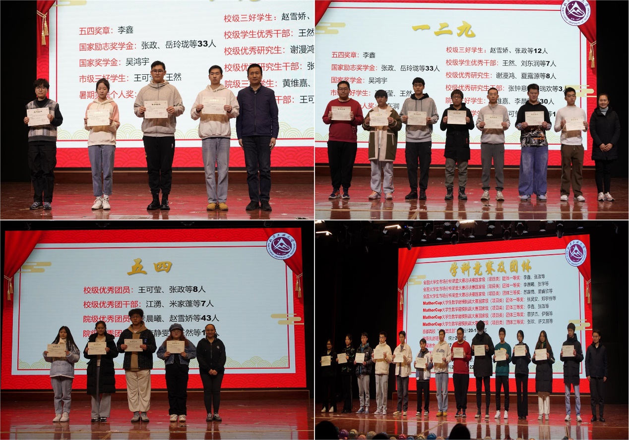 颁奖环节中,贺映勇为获得国家奖学金、国家励志奖学金、市级三好学生、学校五四青年奖章的学生代表颁奖;夏丹梅为获得暑期社会实践先进个人、校院两级三好学生、校院两级优秀学生干部、校级优秀研究生干部、校级优秀研究生的学生代表颁奖;曹琪为获得校级院级优秀团员和优秀团干部的学生代表颁奖;熊敏为获得重大竞赛获奖、首都高校“活力团支部”、市级先进班集体、校级优秀班级、校级优秀团支部、院级优秀班级和院级五星宿舍的学生代表颁奖。