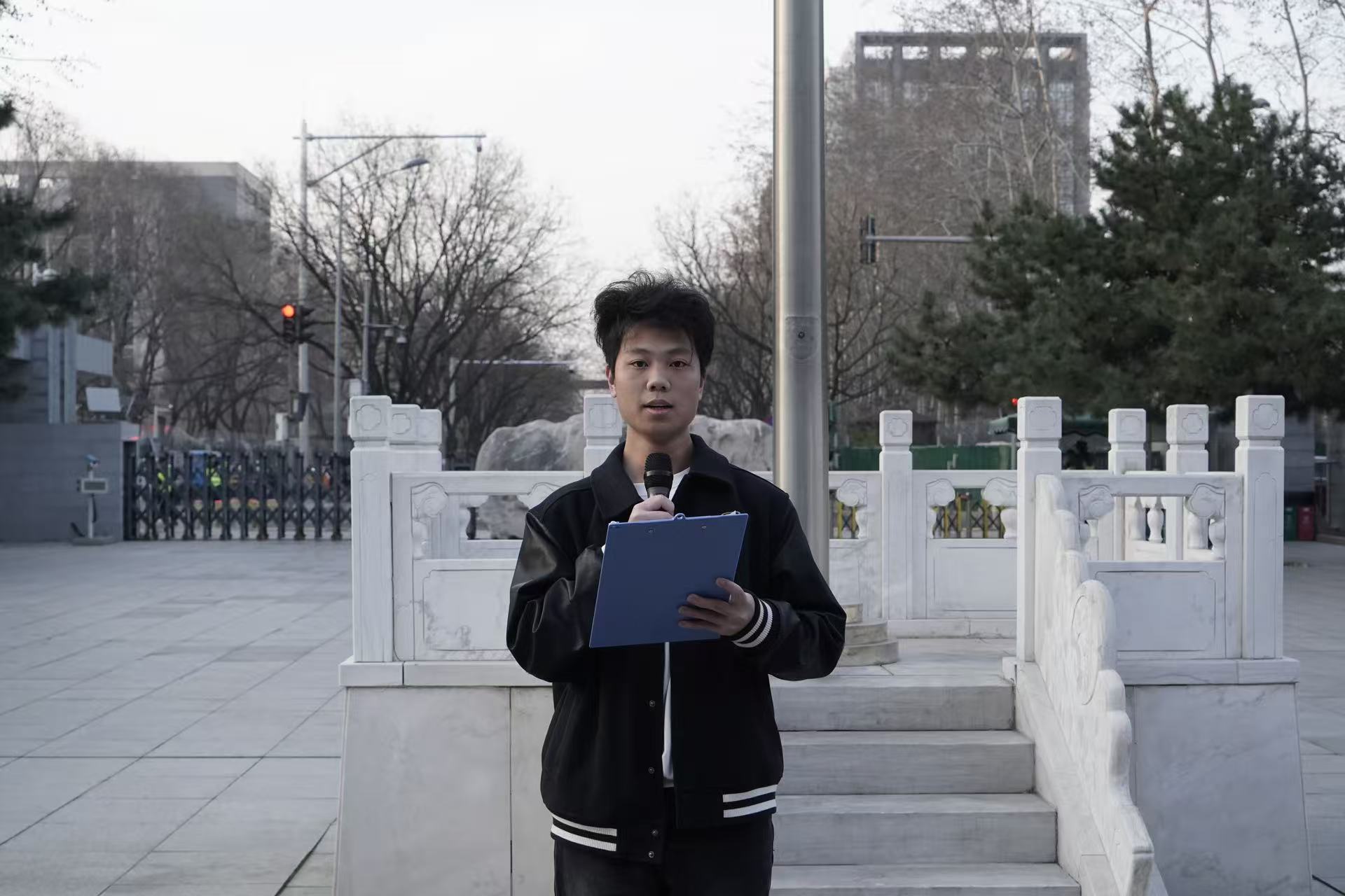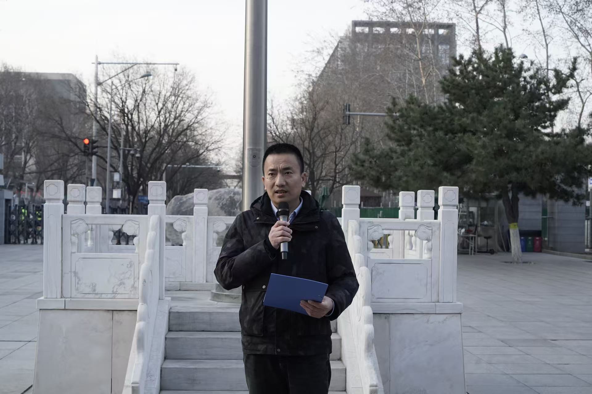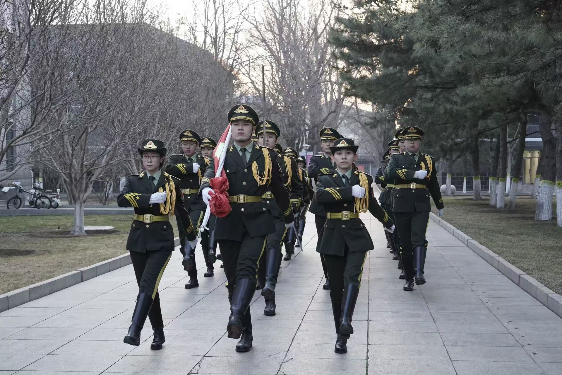 晨光初露,国旗护卫队迈着铿锵有力的步伐护送国旗走向升旗台。伴随着雄壮的《义勇军进行曲》,五星红旗冉冉升起,全体师生肃立行注目礼。