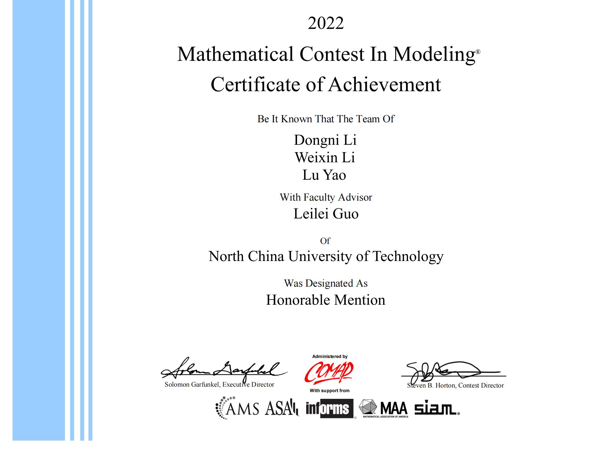 近日,由美国数学及其应用联合会主办的2022年国际大学生数学建模竞赛成绩揭晓。十大信誉官网有14个代表队参赛,获得二等奖(Honorable Mention)5项(15人)。